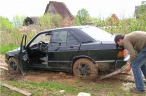 При попадании автомобиля в грязь и потере динамики движения не стоит жать на газ и пытаться выскочить из жижи. Машина при замедлении хода просто проскальзывает всеми ведущими колёсами и закапывается в землю. Не бойтесь испачкаться: это всё равно случится в процессе вызволения автомобиля, коль уж застряли. При наличии лопаты в багажнике и деревьев рядом можно подкопать почву вокруг колеса, положить ветки для уплотнения опоры на поверхность. При трогании на газ рекомендуется жать мягко, чтобы начать плавное движение. При неудаче следует повторить все действия с лопатой и ветками снова.